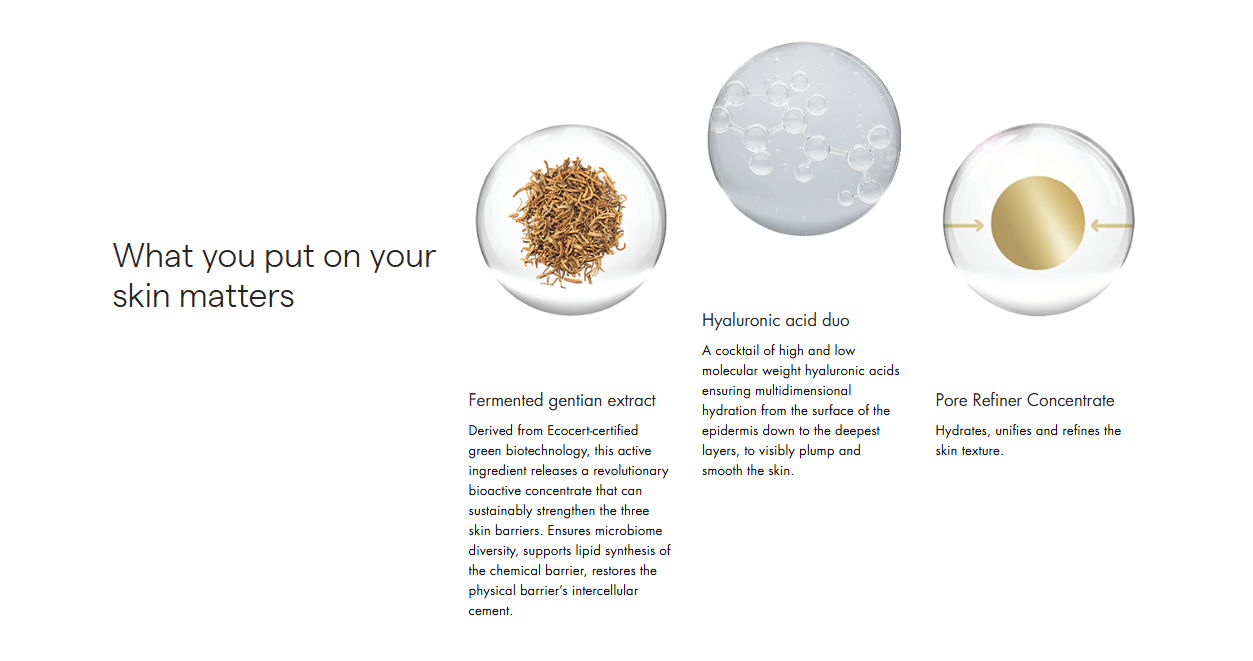 Fermented gentian extract - Derived from Ecocert-certified green biotechnology, this active ingredient releases a revolutionary bioactive concentrate that can sustainably strengthen the three skin barriers. Ensures microbiome diversity, supports lipid synthesis of the chemical barrier, restores the physical barrier’s intercellular cement.